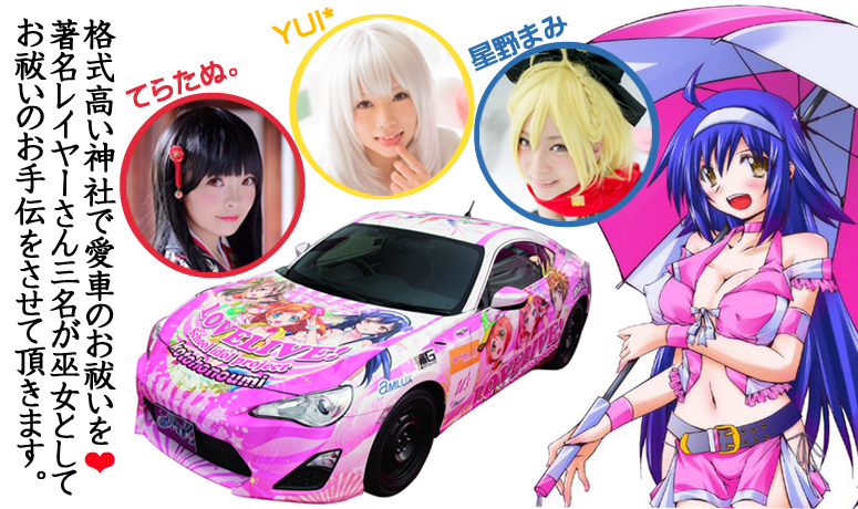 YUI*さん、てらたぬ。さんが巫女コスプレでお祓いをお手伝いさせて頂きます。