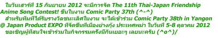 @ รอบคัดเลือกจะเริ่มตั้งแต่ 13:00 น. เป็นต้นไป กรุณาเปลี่ยนชุดคอสเพลย์ให้เสร็จทันเวลา